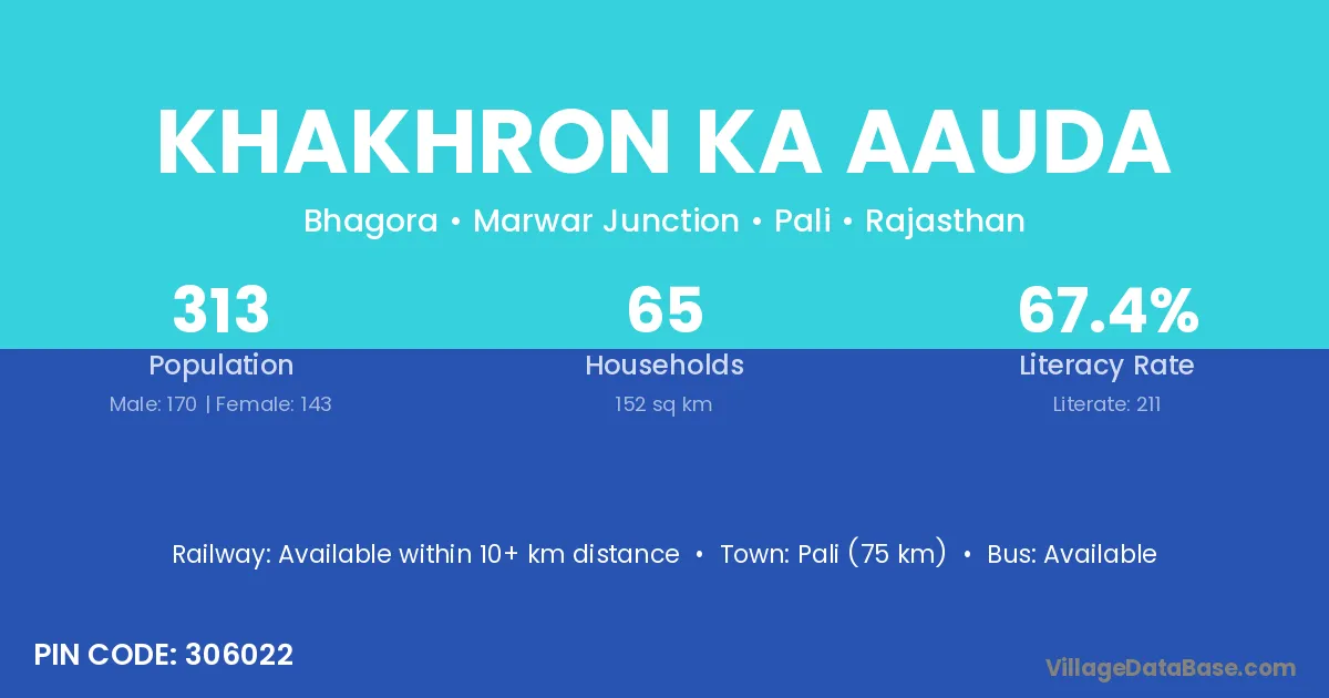 Khakhron Ka Aauda village has a total population of 313 people, of which 170 are males and 143 are females.