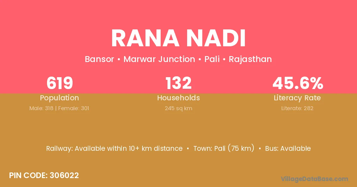 Pali (75 km) is the nearest town to Rana Nadi village for major economic activities and is located approximately 75 km away.