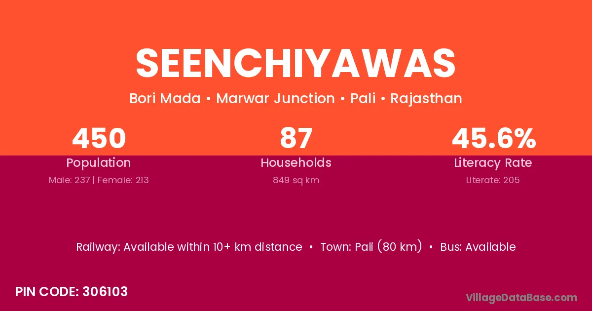 Pali (80 km) is the nearest town to Seenchiyawas village for major economic activities and is located approximately 80 km away.