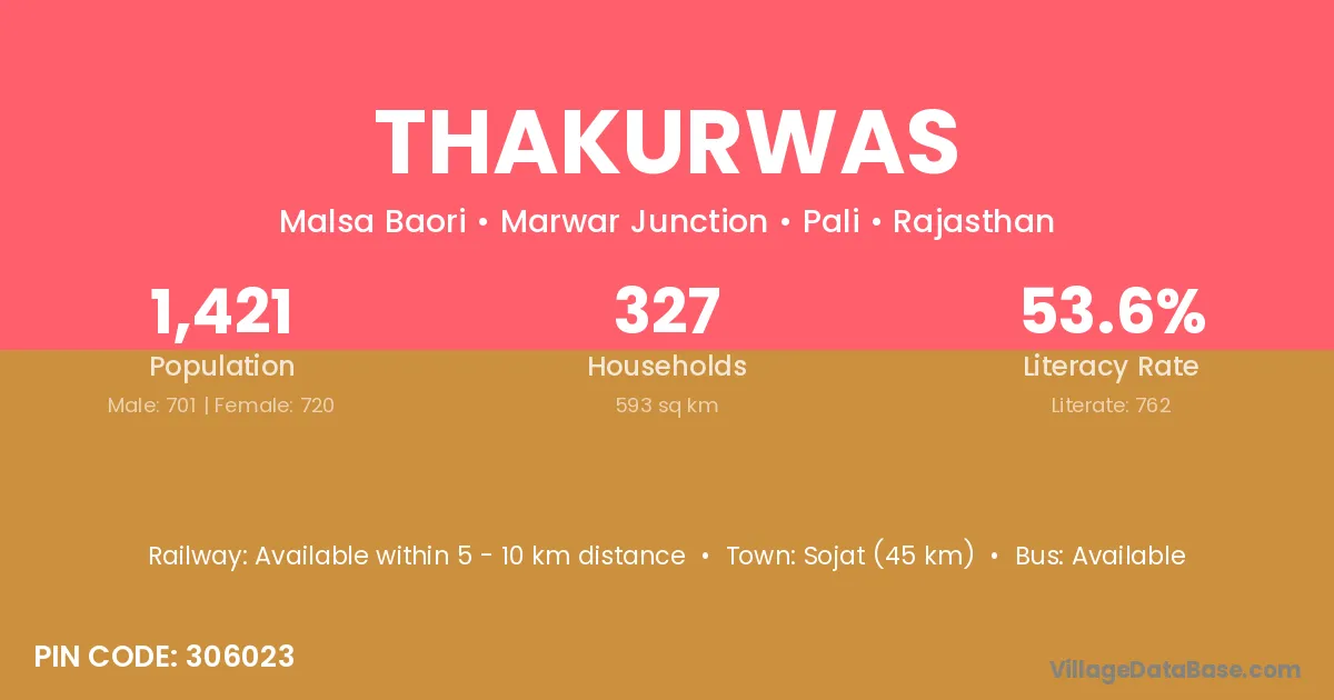 Sojat (45 km) is the nearest town to Thakurwas village for major economic activities and is located approximately 45 km away.