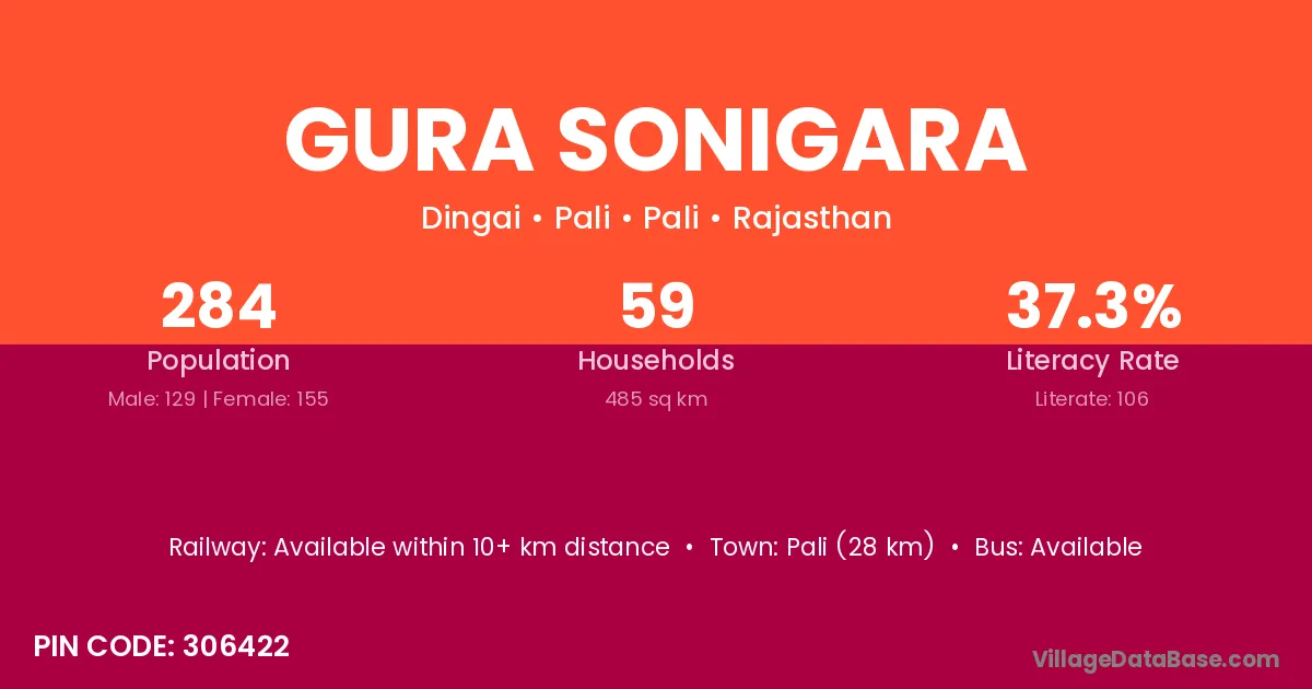 Pali (28 km) is the nearest town to Gura Sonigara village for major economic activities and is located approximately 28 km away.