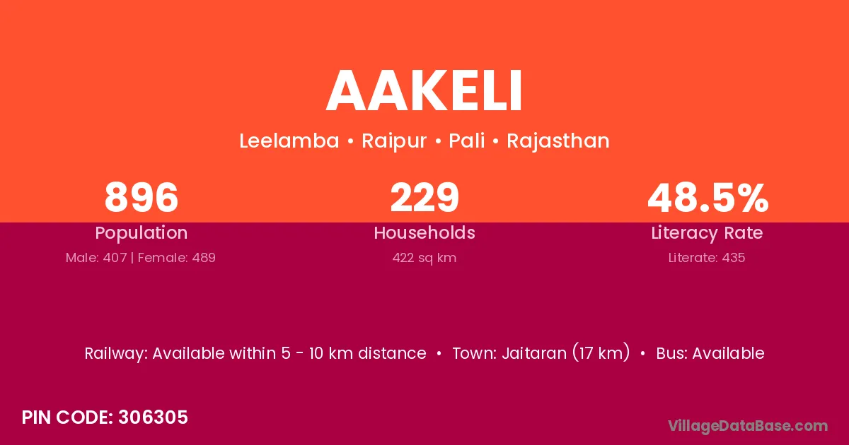Aakeli village has a total population of 896 people, of which 407 are males and 489 are females.