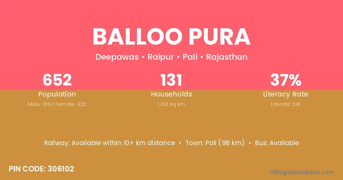 Pali (98 km) is the nearest town to Balloo Pura village for major economic activities and is located approximately 98 km away.