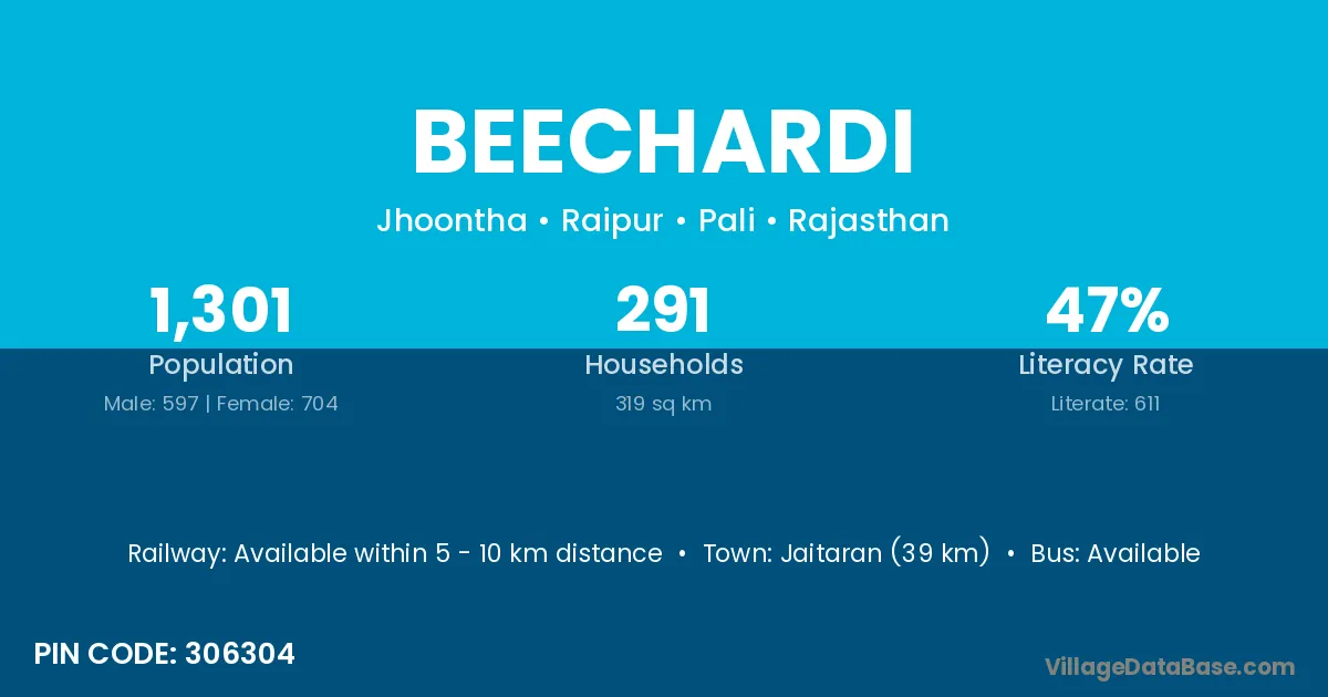 Jaitaran (39 km) is the nearest town to Beechardi village for major economic activities and is located approximately 39 km away.