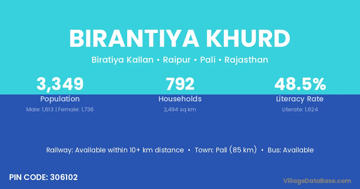 Pali (85 km) is the nearest town to Birantiya Khurd village for major economic activities and is located approximately 85 km away.
