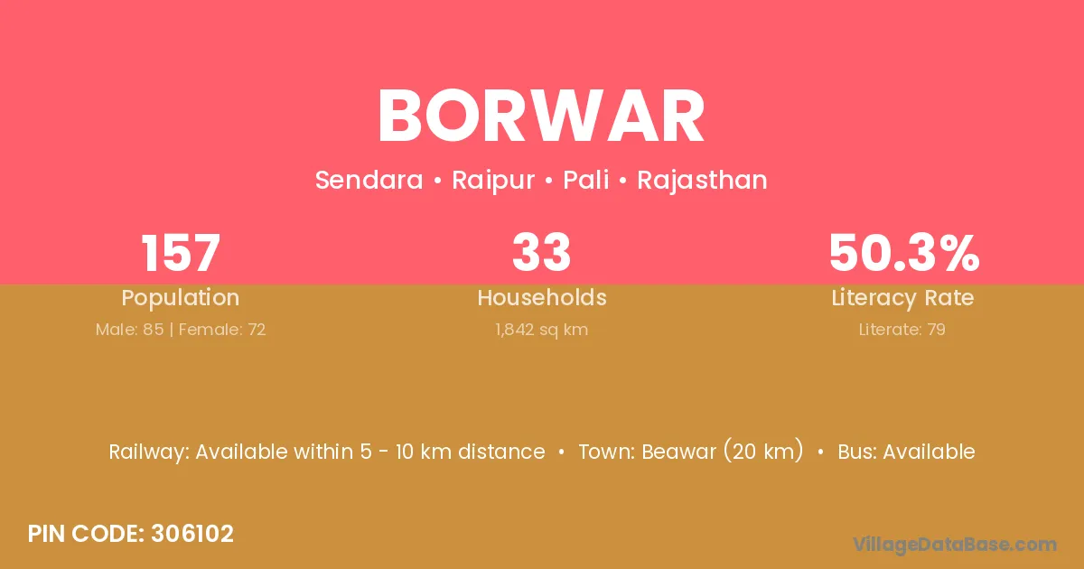Beawar (20 km) is the nearest town to Borwar village for major economic activities and is located approximately 20 km away.