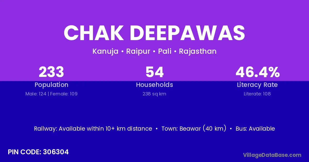 Beawar (40 km) is the nearest town to Chak Deepawas village for major economic activities and is located approximately 40 km away.