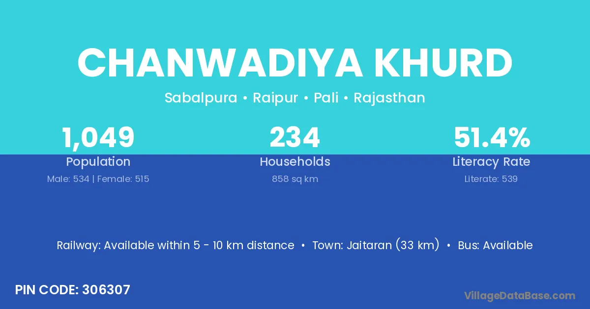 Jaitaran (33 km) is the nearest town to Chanwadiya Khurd village for major economic activities and is located approximately 33 km away.