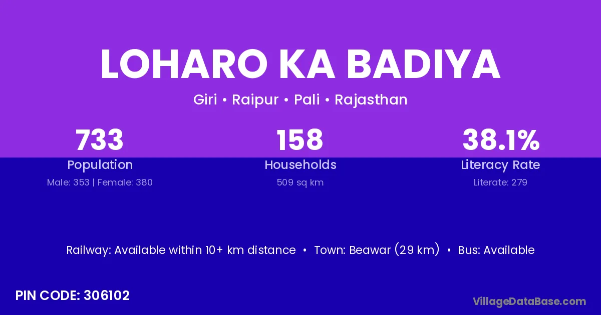 Loharo Ka Badiya village has a total population of 733 people, of which 353 are males and 380 are females.