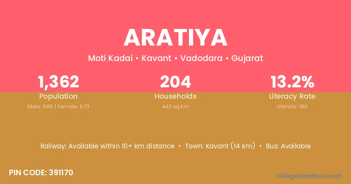 Aratiya village has a total population of 2,041 people, of which 1,034 are males and 1,007 are females.