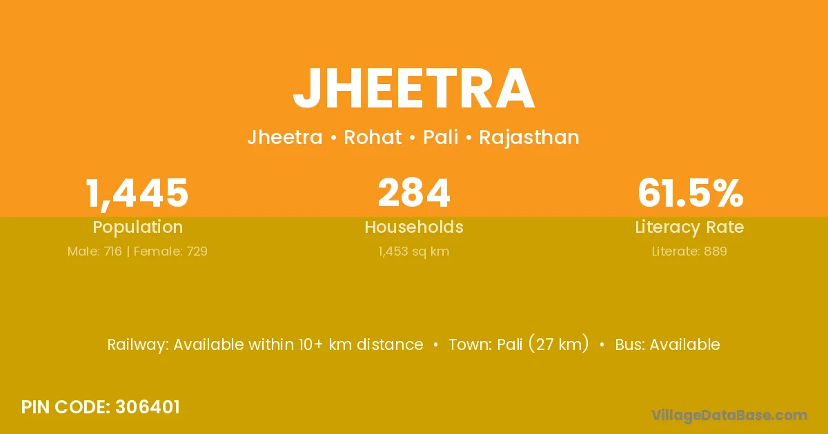 Pali (27 km) is the nearest town to Jheetra village for major economic activities and is located approximately 27 km away.