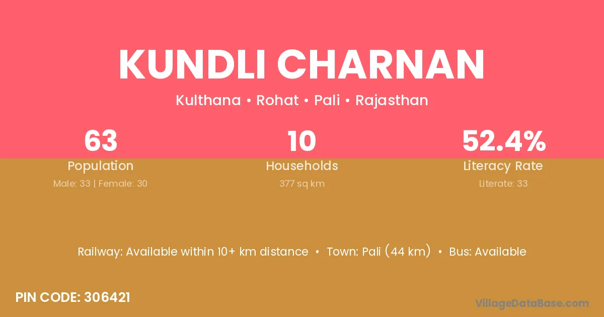 Pali (44 km) is the nearest town to Kundli Charnan village for major economic activities and is located approximately 44 km away.
