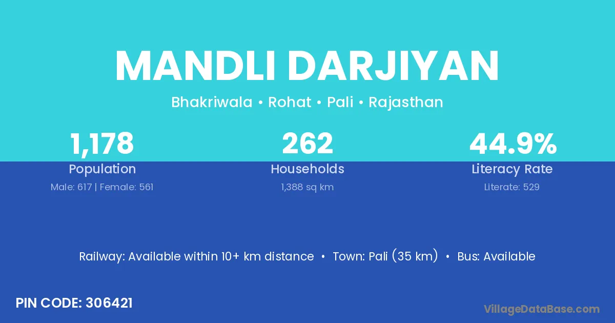 Pali (35 km) is the nearest town to Mandli Darjiyan village for major economic activities and is located approximately 35 km away.