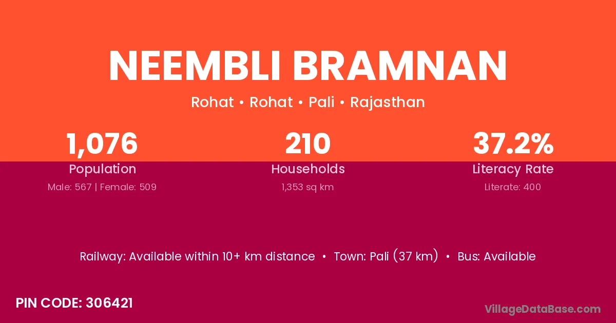 Pali (37 km) is the nearest town to Neembli Bramnan village for major economic activities and is located approximately 37 km away.
