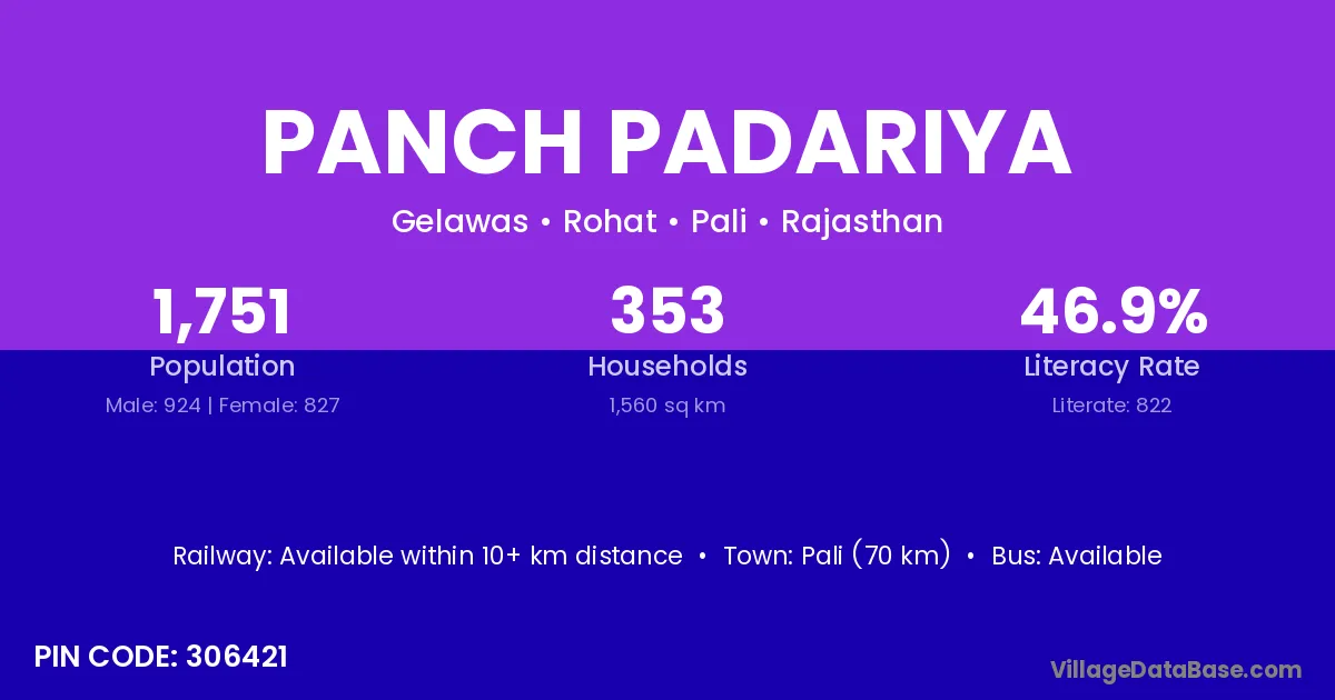 Pali (70 km) is the nearest town to Panch Padariya village for major economic activities and is located approximately 70 km away.