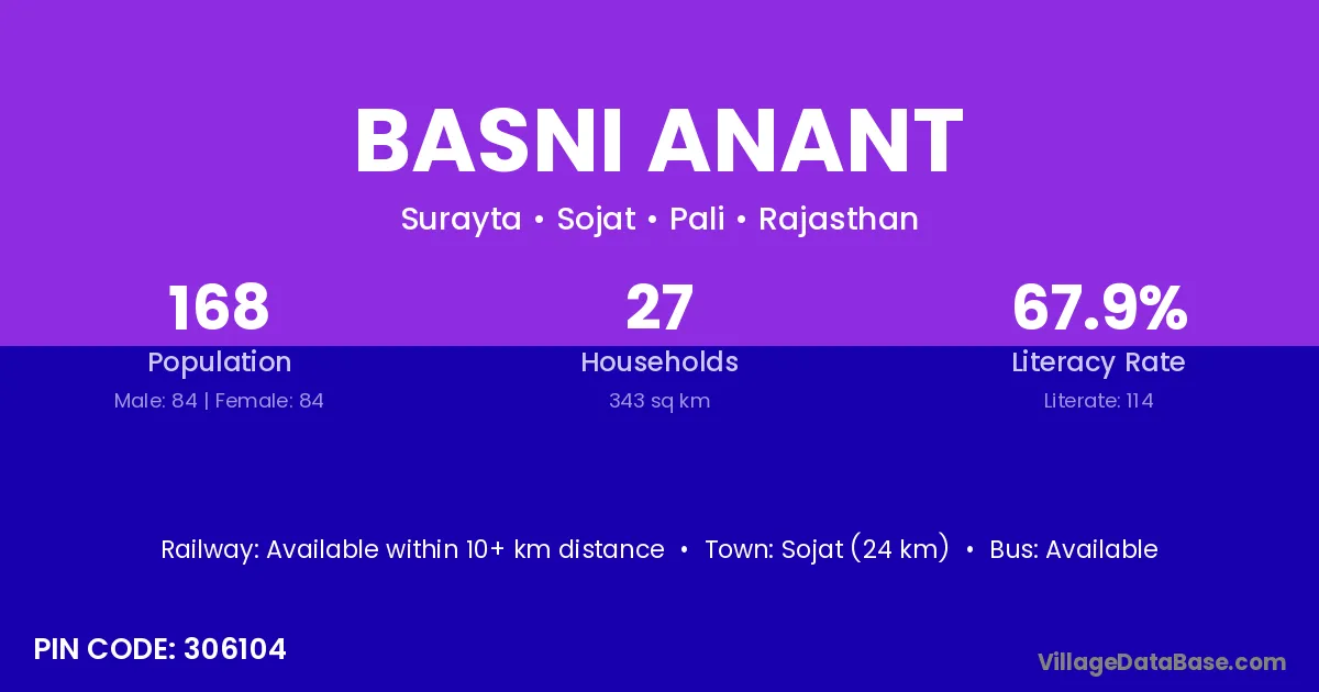 Sojat (24 km) is the nearest town to Basni Anant village for major economic activities and is located approximately 24 km away.