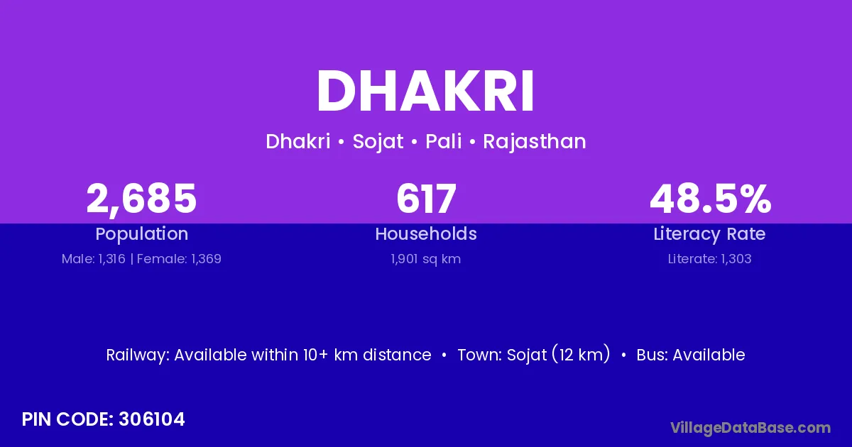 Sojat (12 km) is the nearest town to Dhakri village for major economic activities and is located approximately 12 km away.