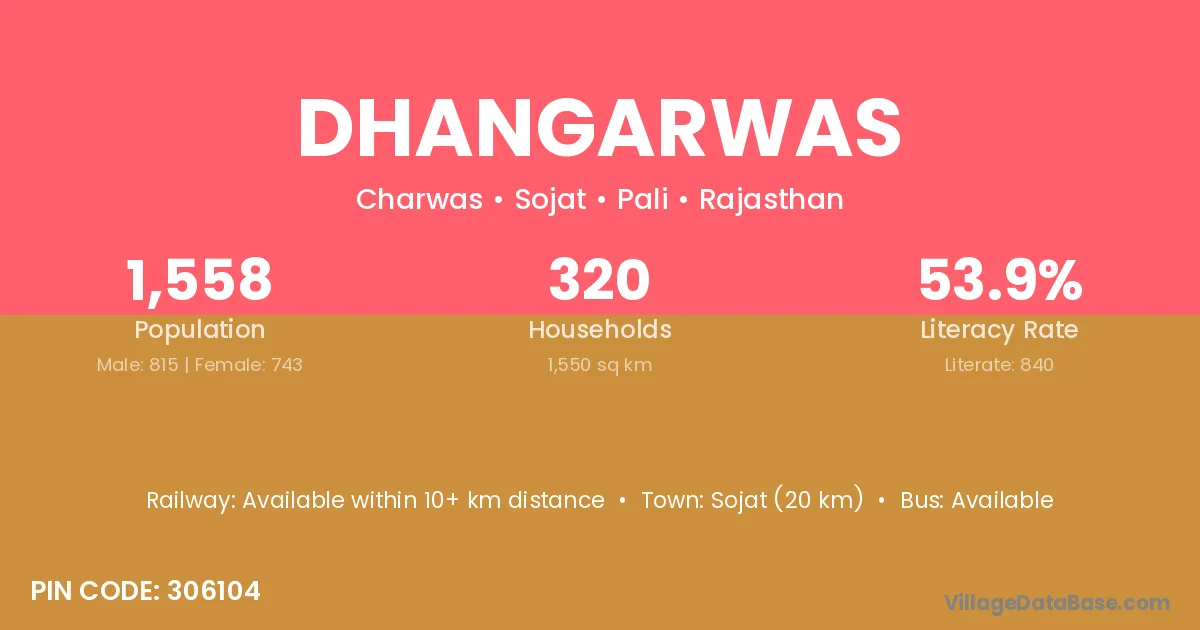 Sojat (20 km) is the nearest town to Dhangarwas village for major economic activities and is located approximately 20 km away.