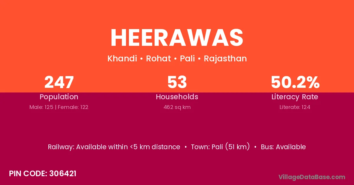 Sojat (32 km) is the nearest town to Heerawas village for major economic activities and is located approximately 32 km away.