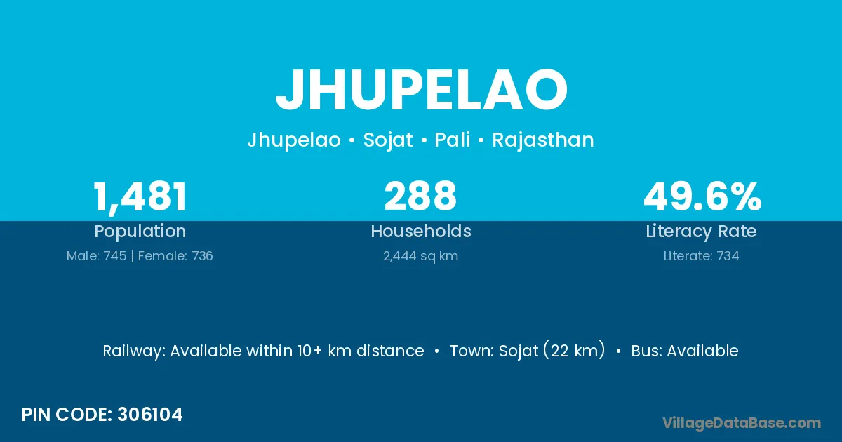 Sojat (22 km) is the nearest town to Jhupelao village for major economic activities and is located approximately 22 km away.