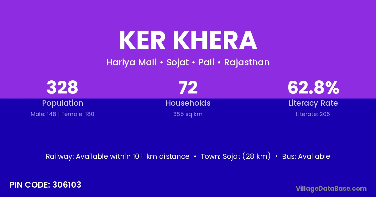 Sojat (28 km) is the nearest town to Ker Khera village for major economic activities and is located approximately 28 km away.