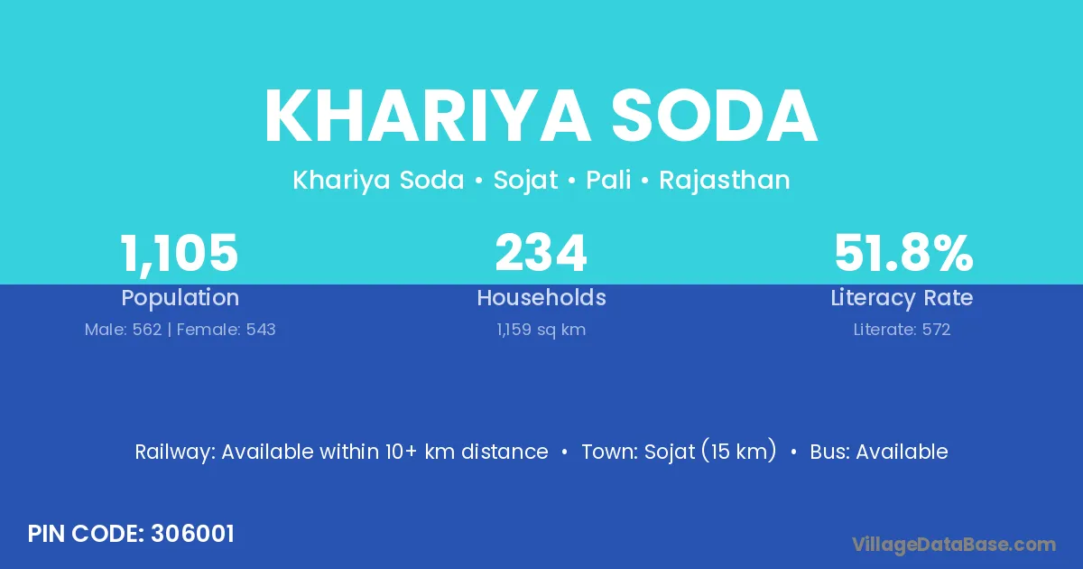 Sojat (15 km) is the nearest town to Khariya Soda village for major economic activities and is located approximately 15 km away.