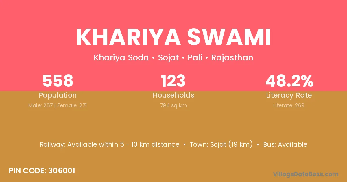 Sojat (19 km) is the nearest town to Khariya Swami village for major economic activities and is located approximately 19 km away.