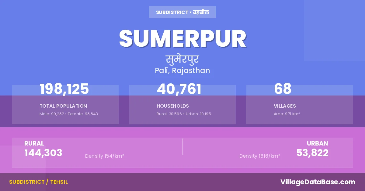 According to the 2011 census The total area of Sumerpur Tehsil is 971 km², with a population of 198125 people. The population density is 204 inhabitants per square kilometre, and there are approximately 40761 houses in the sub district.