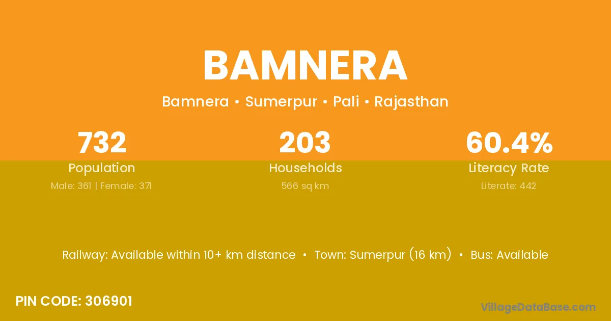 Sumerpur (16 km) is the nearest town to Bamnera village for major economic activities and is located approximately 16 km away.