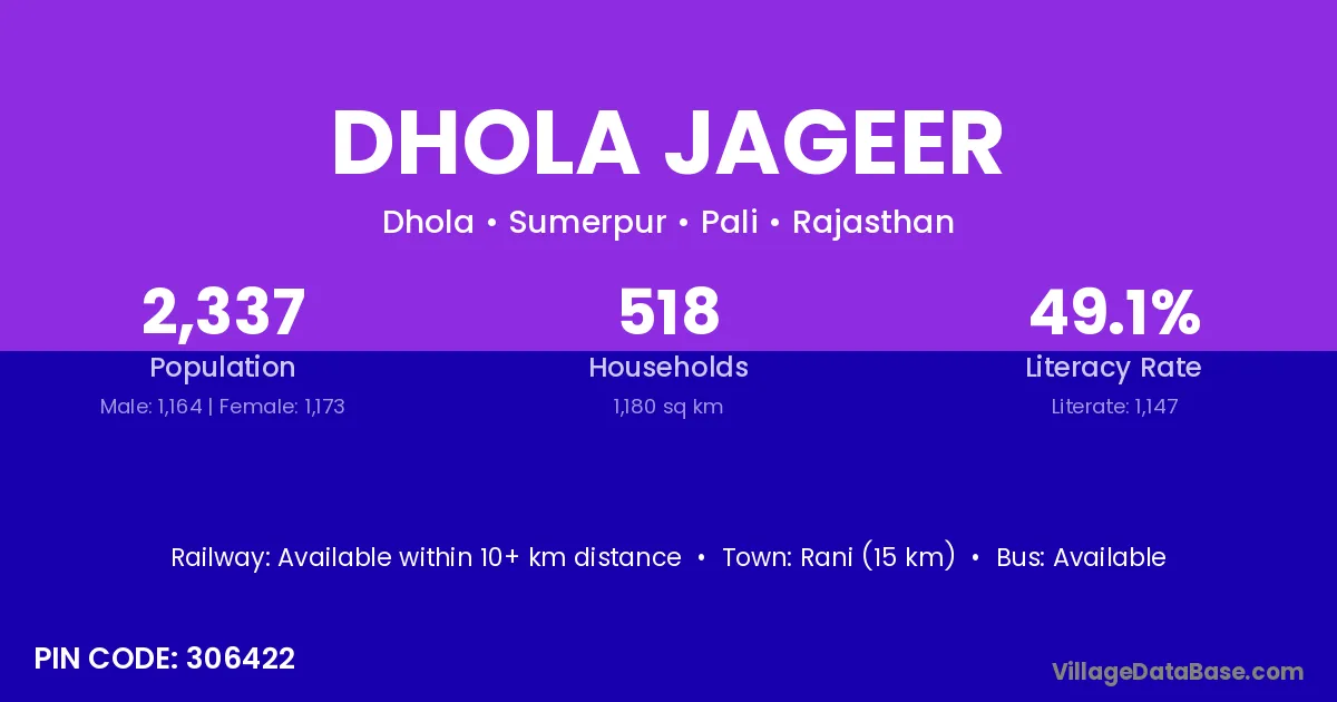 Rani (15 km) is the nearest town to Dhola Jageer village for major economic activities and is located approximately 15 km away.
