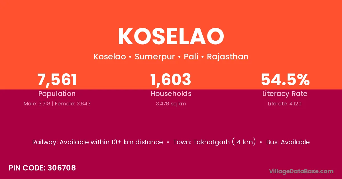 Takhatgarh (14 km) is the nearest town to Koselao village for major economic activities and is located approximately 14 km away.