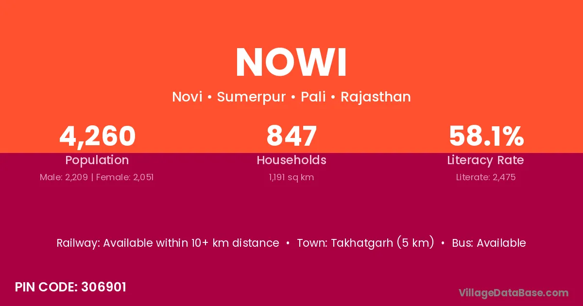 Takhatgarh (5 km) is the nearest town to Nowi village for major economic activities and is located approximately 5 km away.
