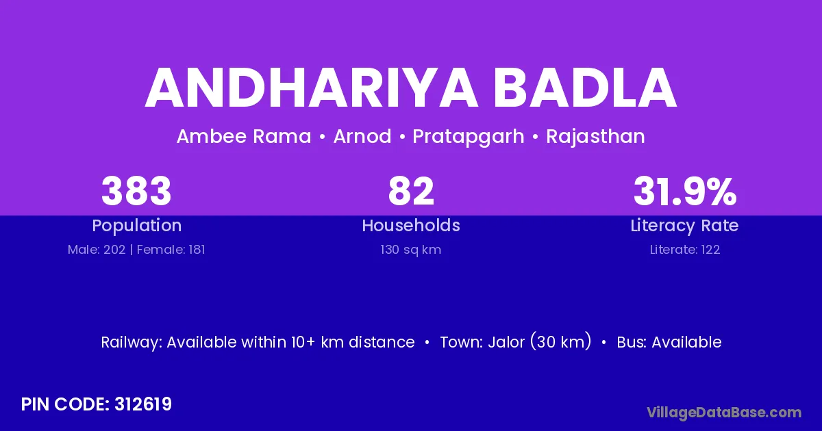 Jalor (30 km) is the nearest town to Andhariya Badla village for major economic activities and is located approximately 30 km away.