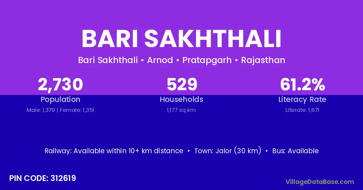 Jalor (30 km) is the nearest town to Bari Sakhthali village for major economic activities and is located approximately 30 km away.