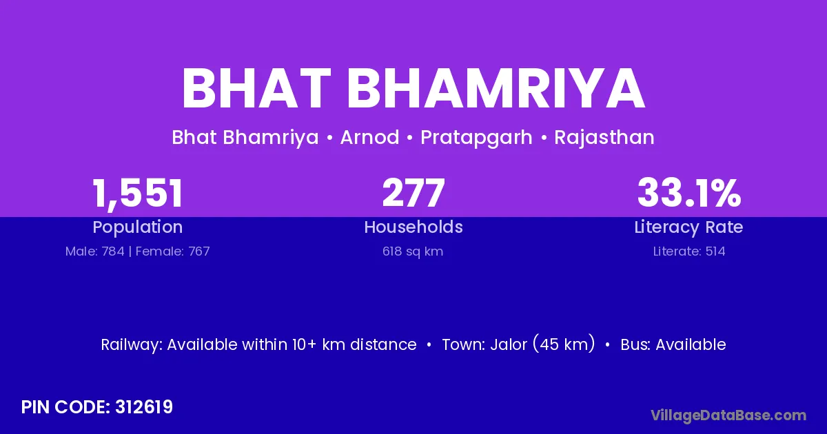 Jalor (45 km) is the nearest town to Bhat Bhamriya village for major economic activities and is located approximately 45 km away.