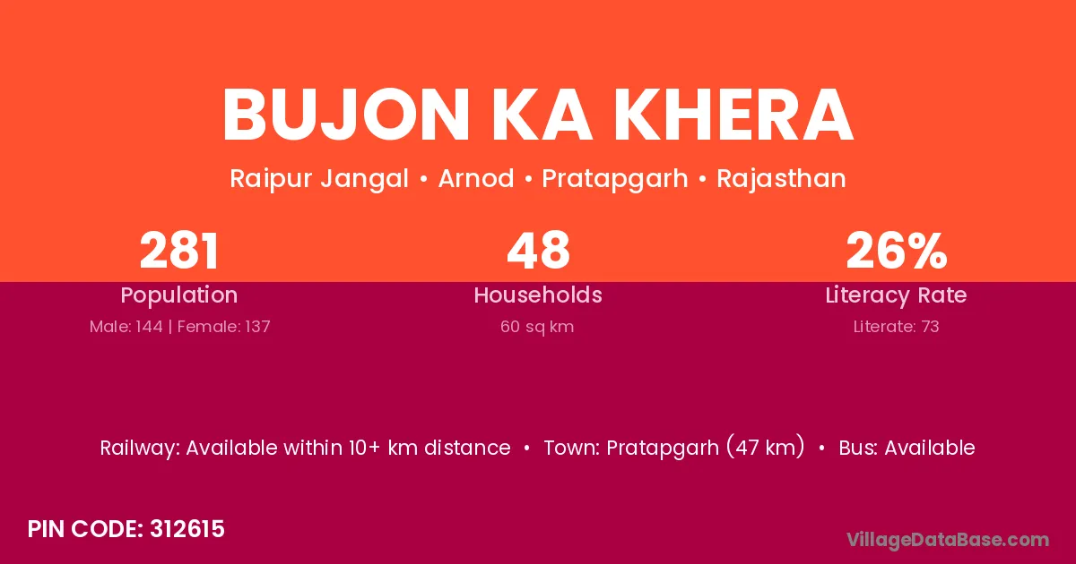 Bujon Ka Khera village has a total population of 281 people, of which 144 are males and 137 are females.