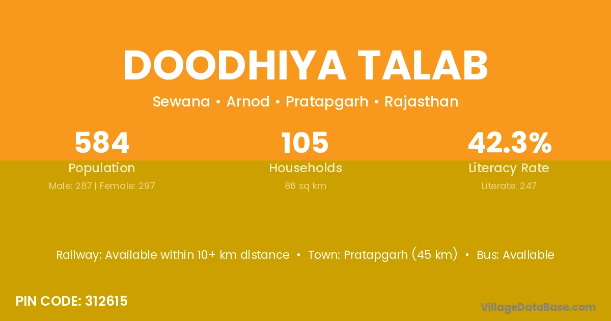 Pratapgarh (45 km) is the nearest town to Doodhiya Talab village for major economic activities and is located approximately 45 km away.