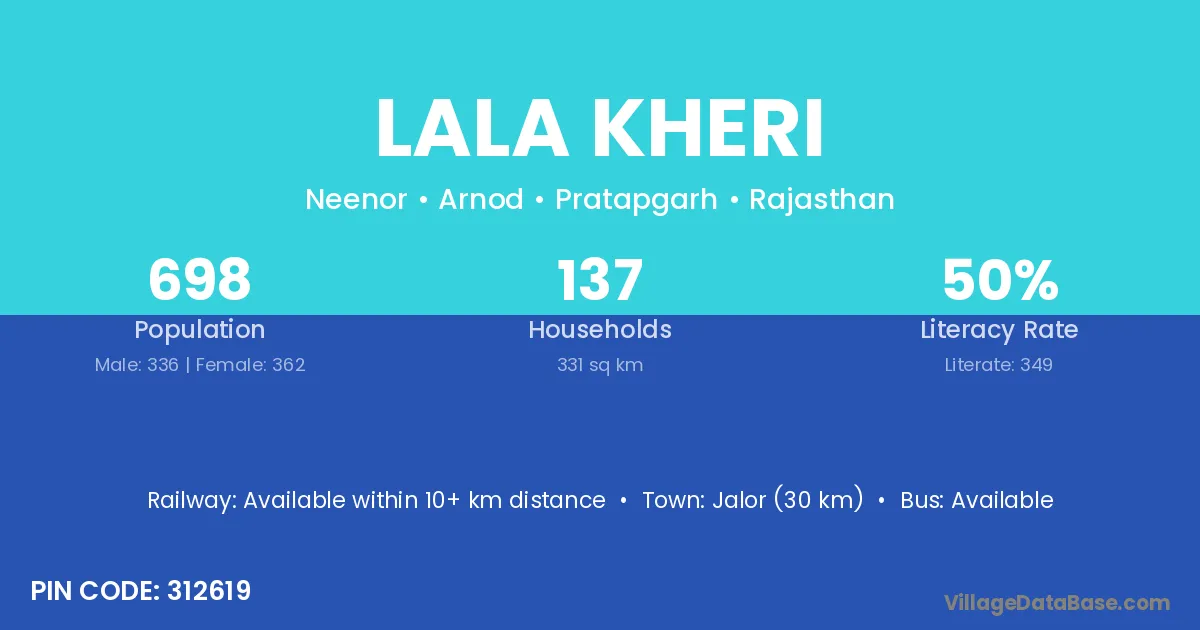 Jalor (30 km) is the nearest town to Lala Kheri village for major economic activities and is located approximately 30 km away.