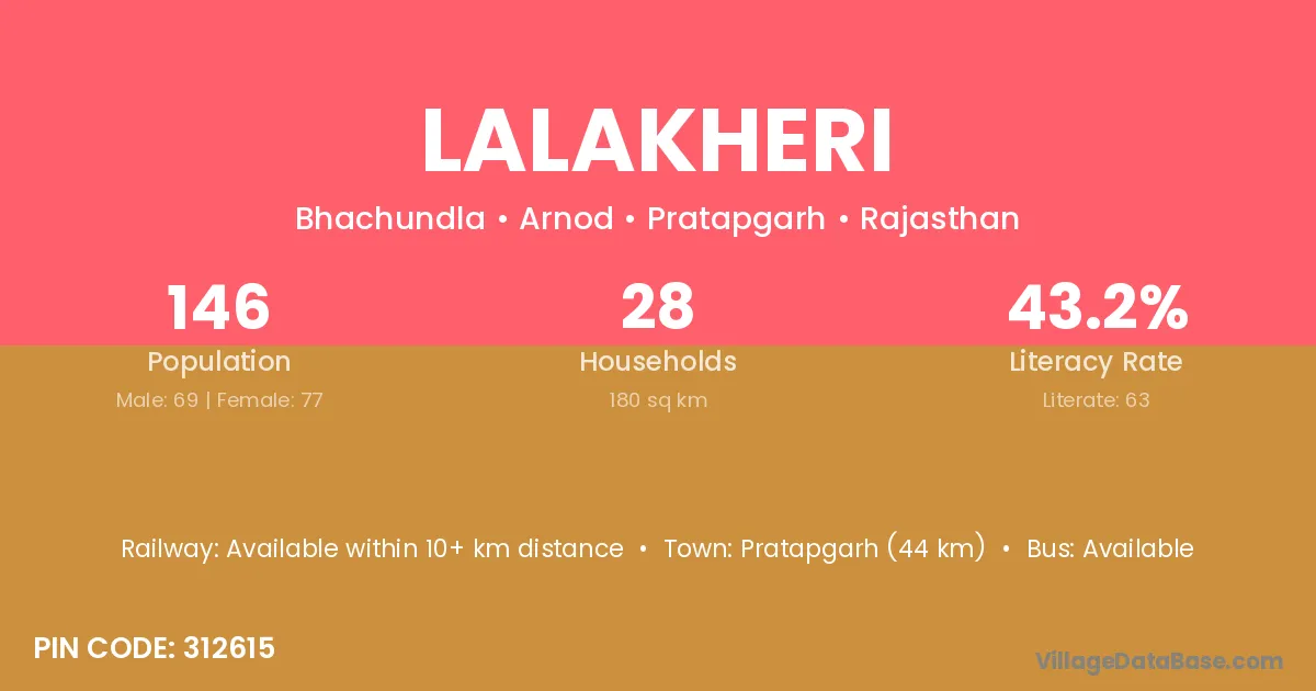 Lalakheri village has a total population of 146 people, of which 69 are males and 77 are females.