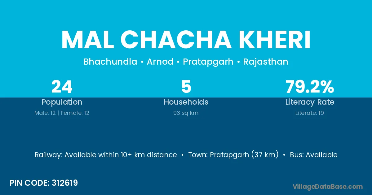Mal Chacha Kheri village has a total population of 24 people, of which 12 are males and 12 are females.