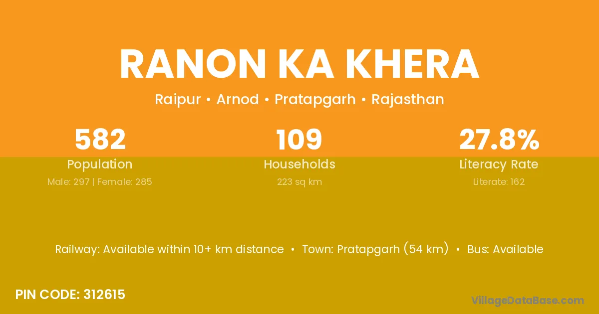 Ranon Ka Khera village has a total population of 582 people, of which 297 are males and 285 are females.