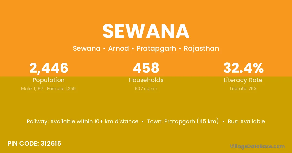 Pratapgarh (45 km) is the nearest town to Sewana village for major economic activities and is located approximately 45 km away.