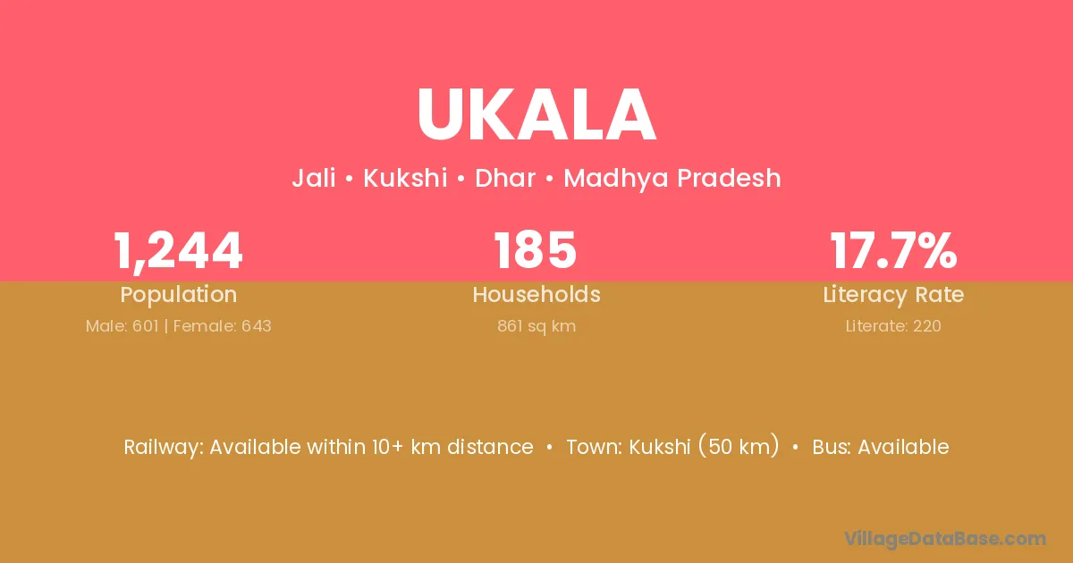 The literacy rate of Ukala village is 44.24%. Male literacy stands at 52.33% and female literacy at 35.44%.