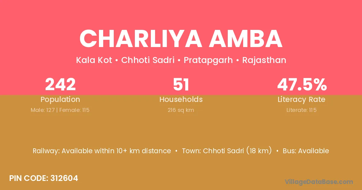 Chhoti Sadri (18 km) is the nearest town to Charliya Amba village for major economic activities and is located approximately 18 km away.