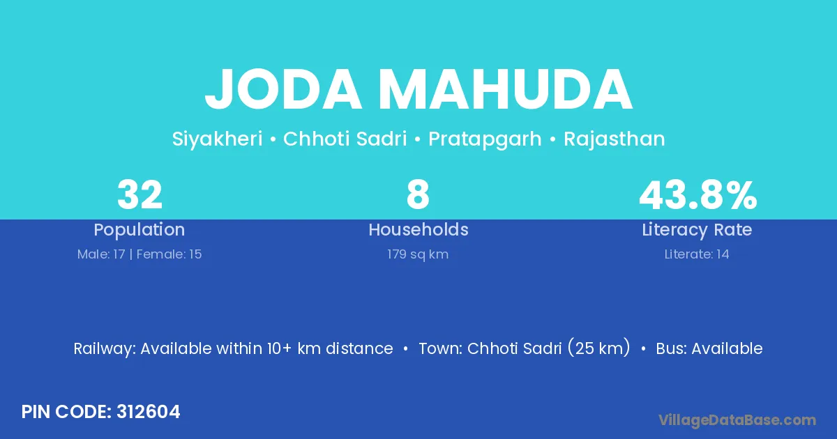 Chhoti Sadri (25 km) is the nearest town to Joda Mahuda village for major economic activities and is located approximately 25 km away.