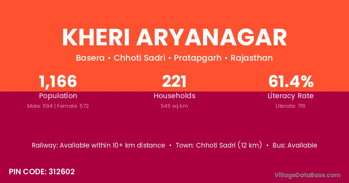 Chhoti Sadri (12 km) is the nearest town to Kheri Aryanagar village for major economic activities and is located approximately 12 km away.