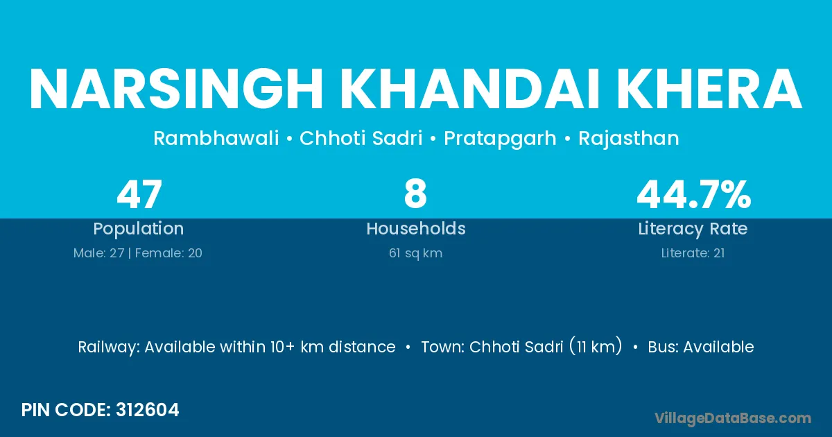 Narsingh Khandai Khera village has a total population of 47 people, of which 27 are males and 20 are females.
