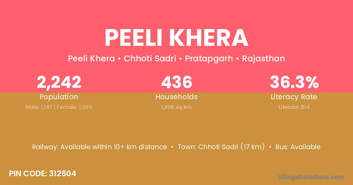 Chhoti Sadri (17 km) is the nearest town to Peeli Khera village for major economic activities and is located approximately 17 km away.