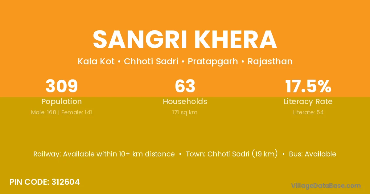 Chhoti Sadri (19 km) is the nearest town to Sangri Khera village for major economic activities and is located approximately 19 km away.