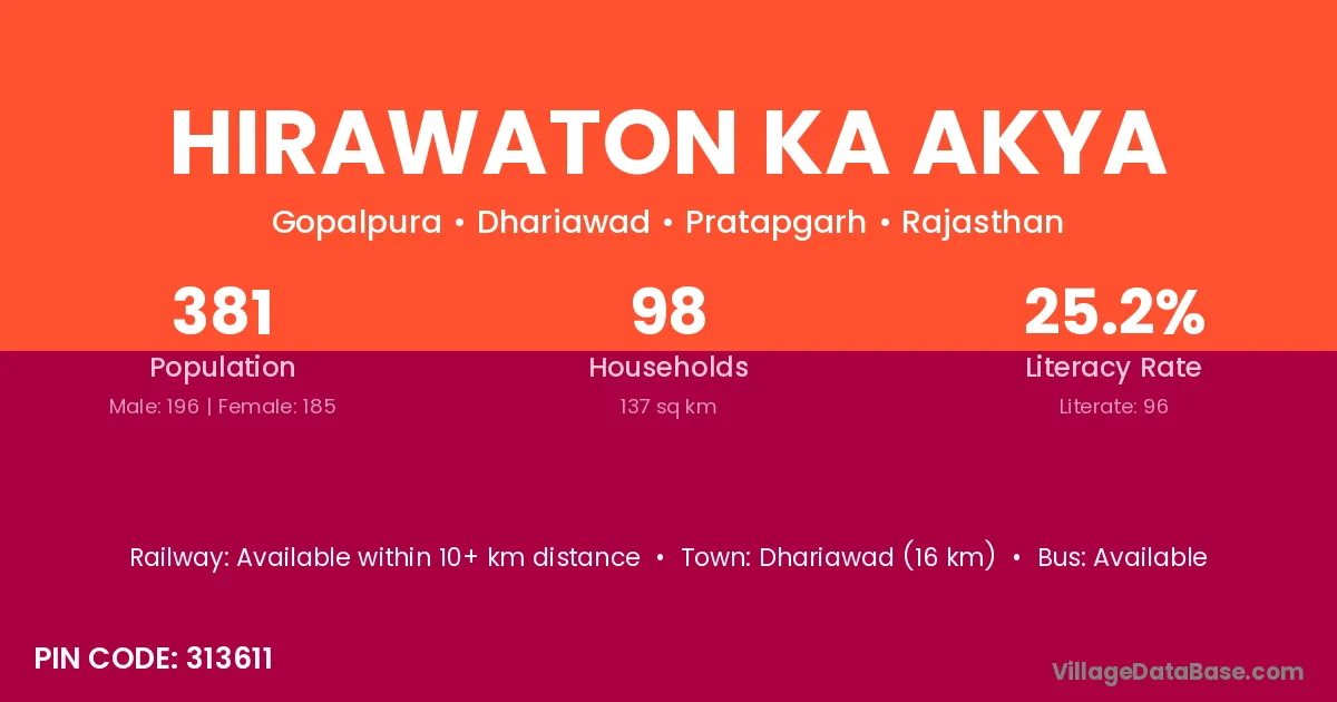 Dhariawad (16 km) is the nearest town to Hirawaton Ka Akya village for major economic activities and is located approximately 16 km away.